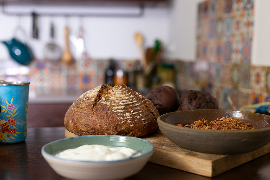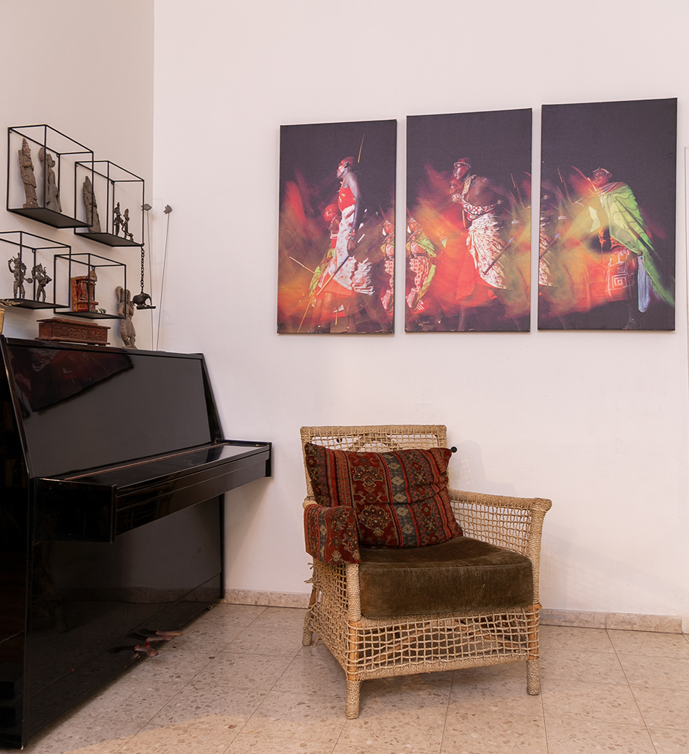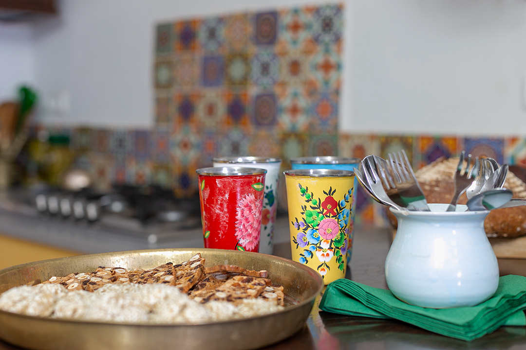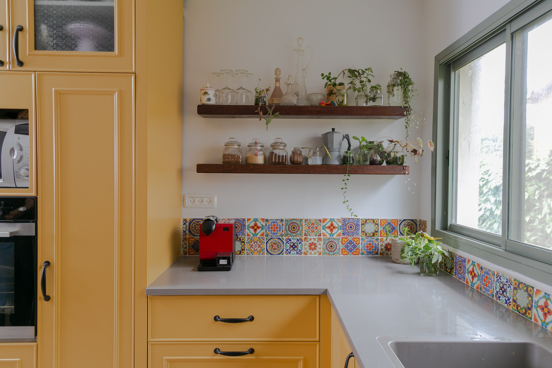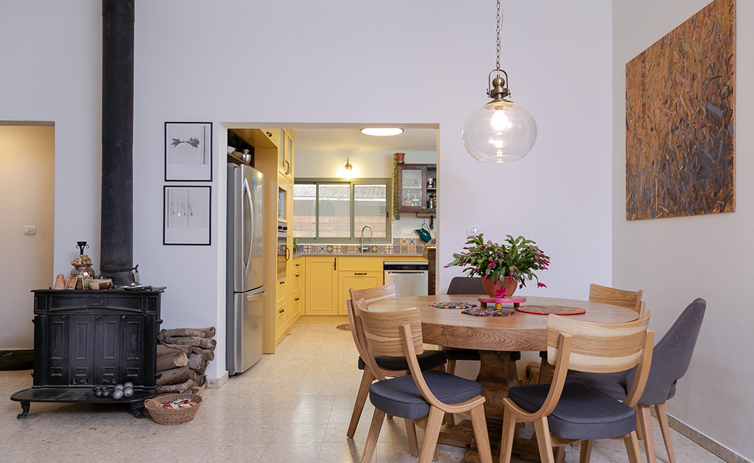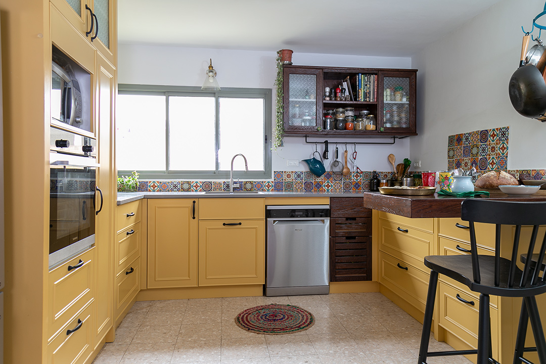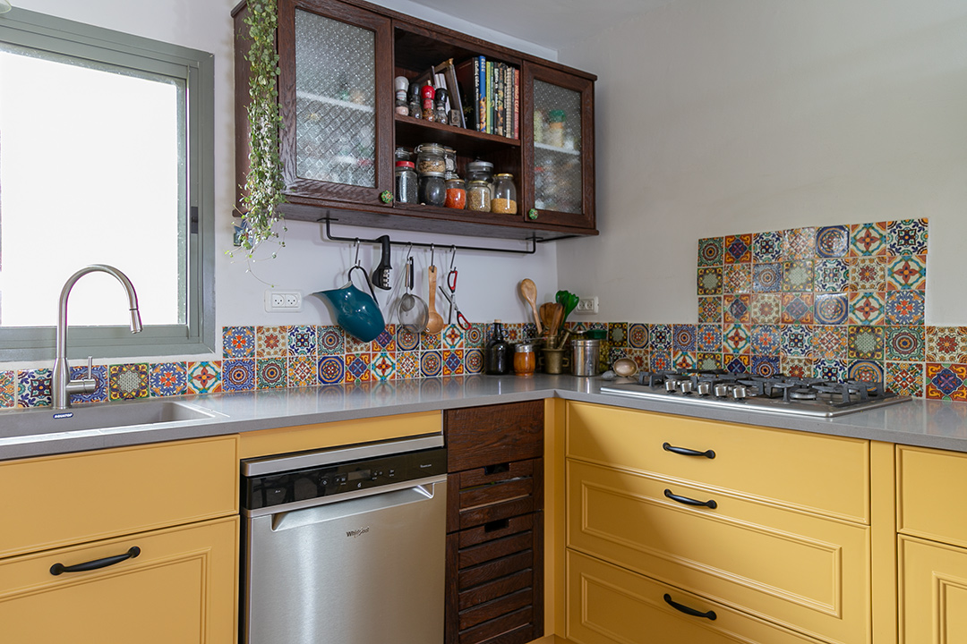 המטבח קיבל חיים חדשים עם גוון חרדל נועז ופינת ישיבה אינטימית המזמינה לשיחות ארוכות. דלתות ירוק בקבוק וריצוף צבעוני בחדרי הרחצה משלימים את הסגנון האקלקטי, המשתלב בהרמוניה עם פריטים מהמזרח ואוצרות שנאספו משווקים ברחבי העולם.